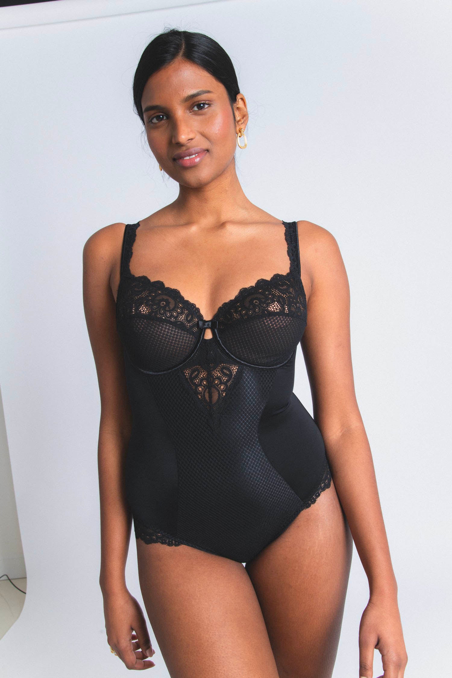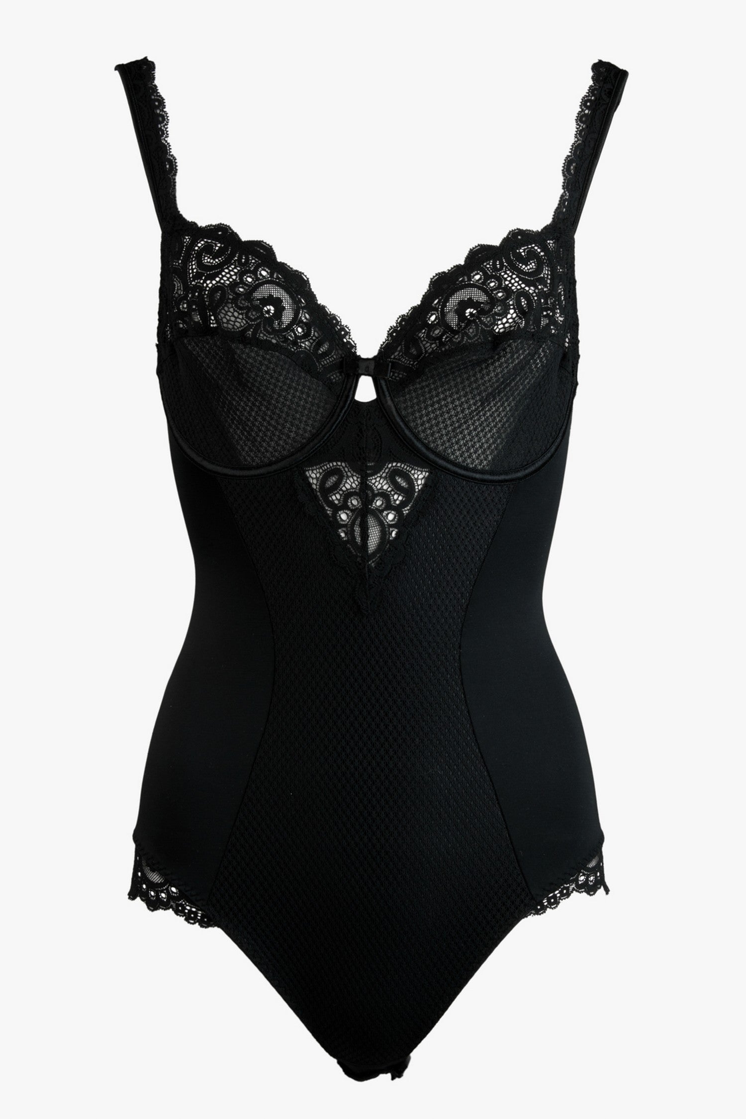An underwired bodysuit combining French lace and fishnet, to wear on top or underneath, for a retro and chic style.
