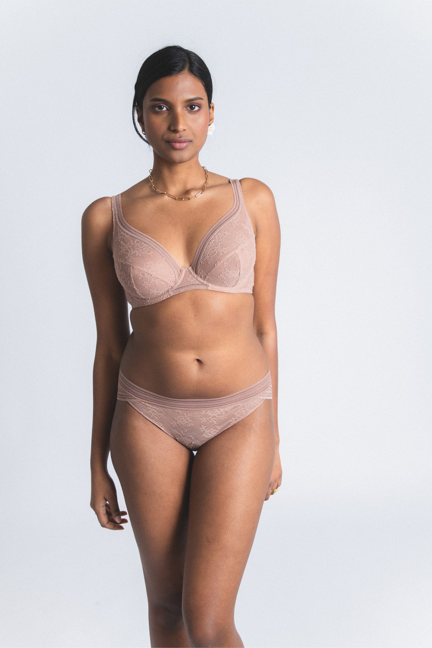 A pair of French lace panties that are covering, comfortable and refined with a lovely natural curve.