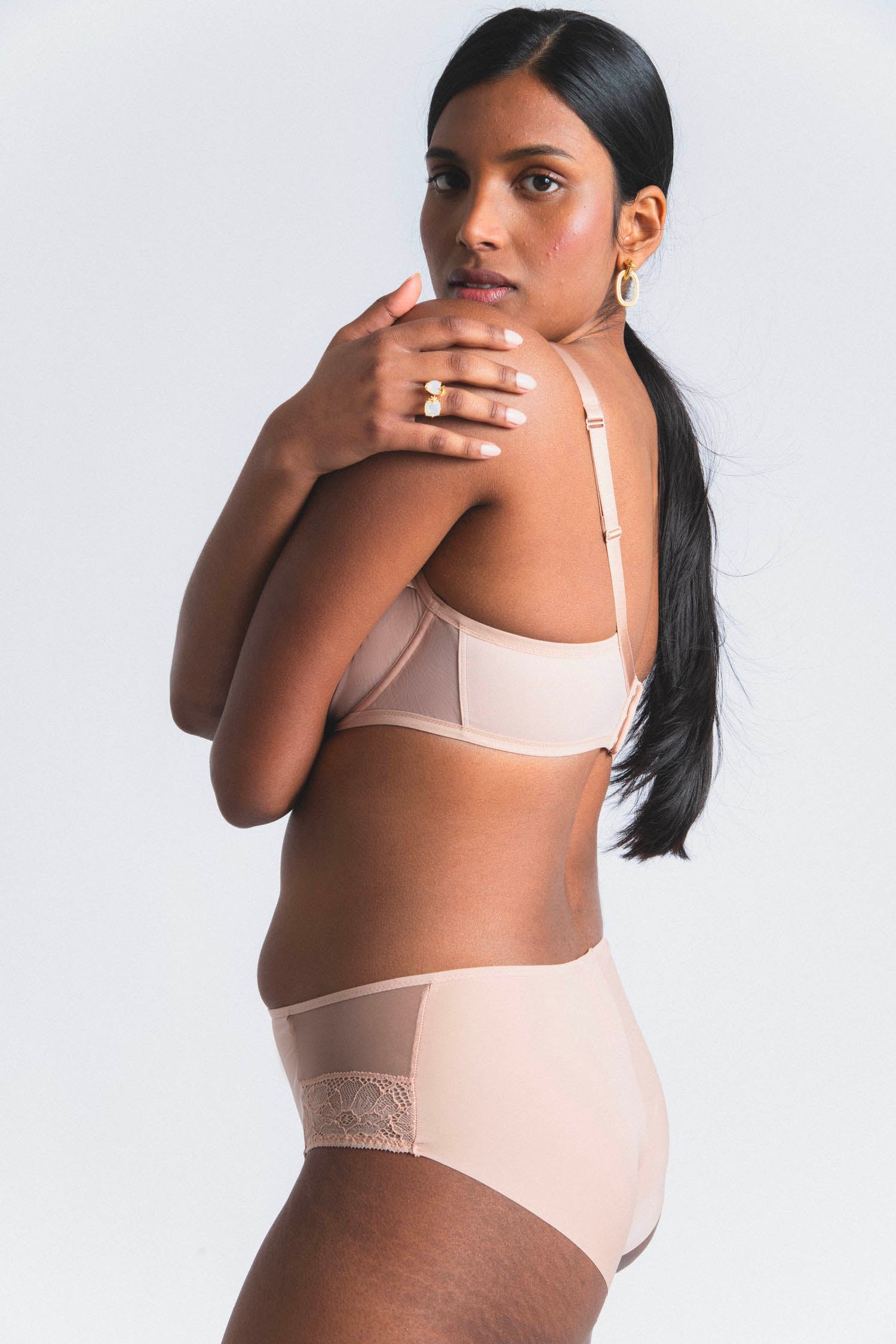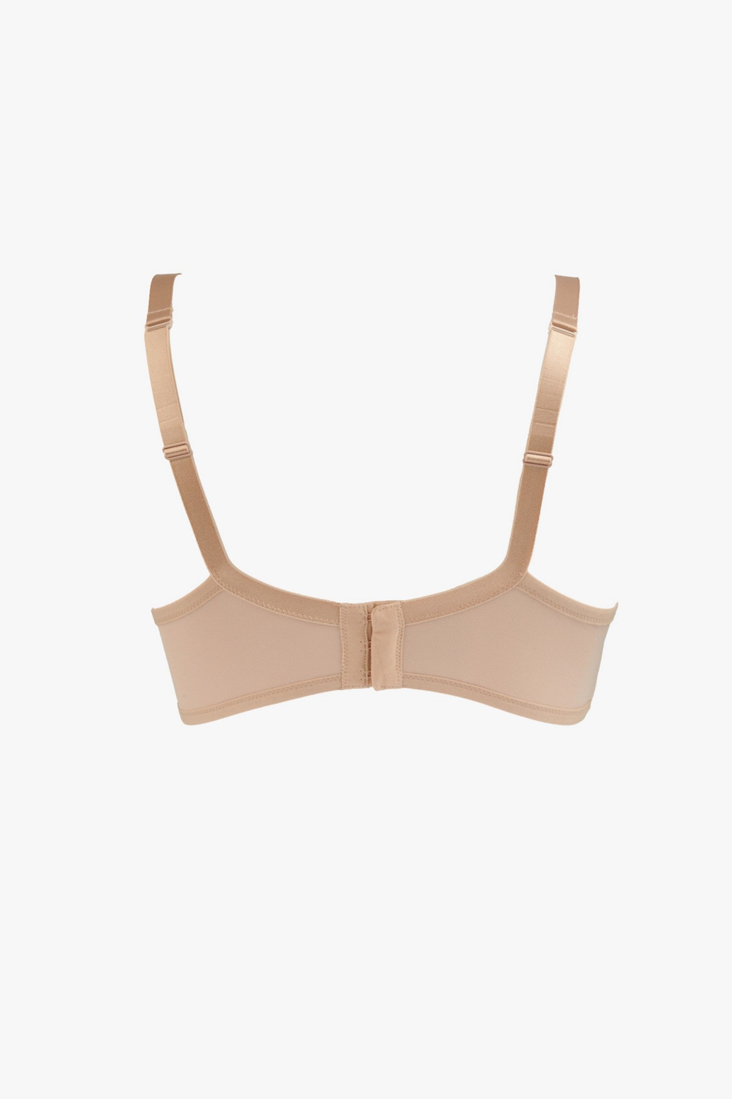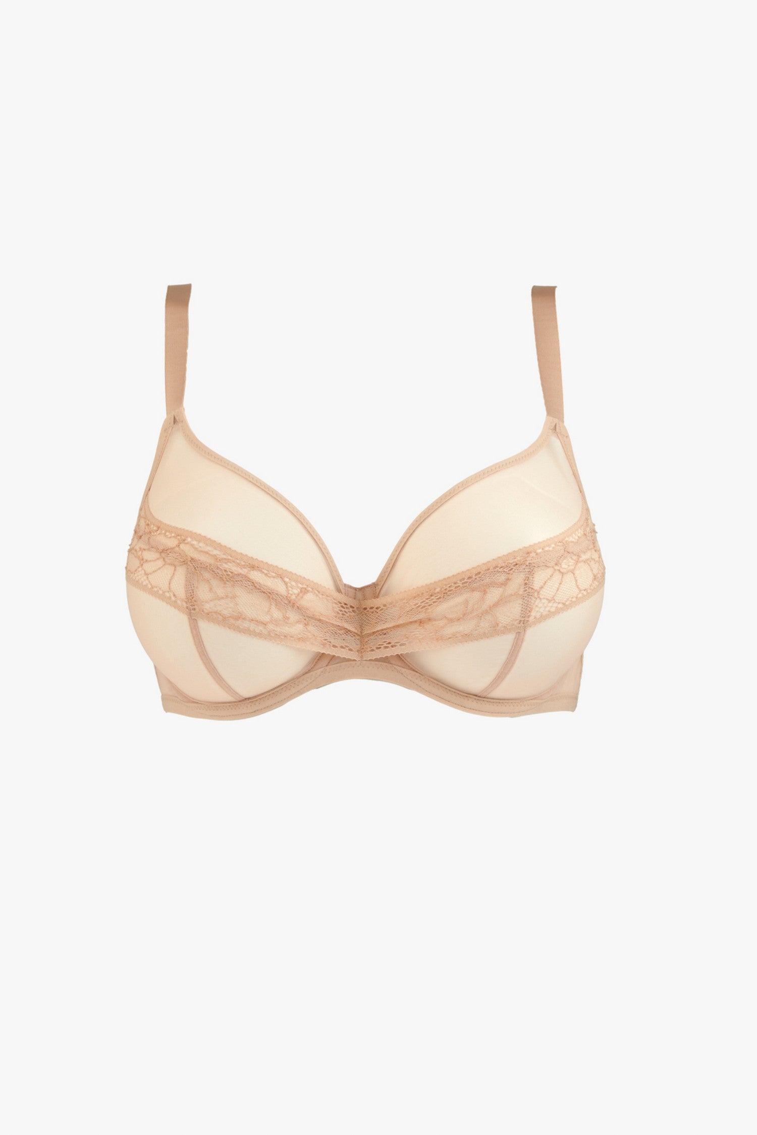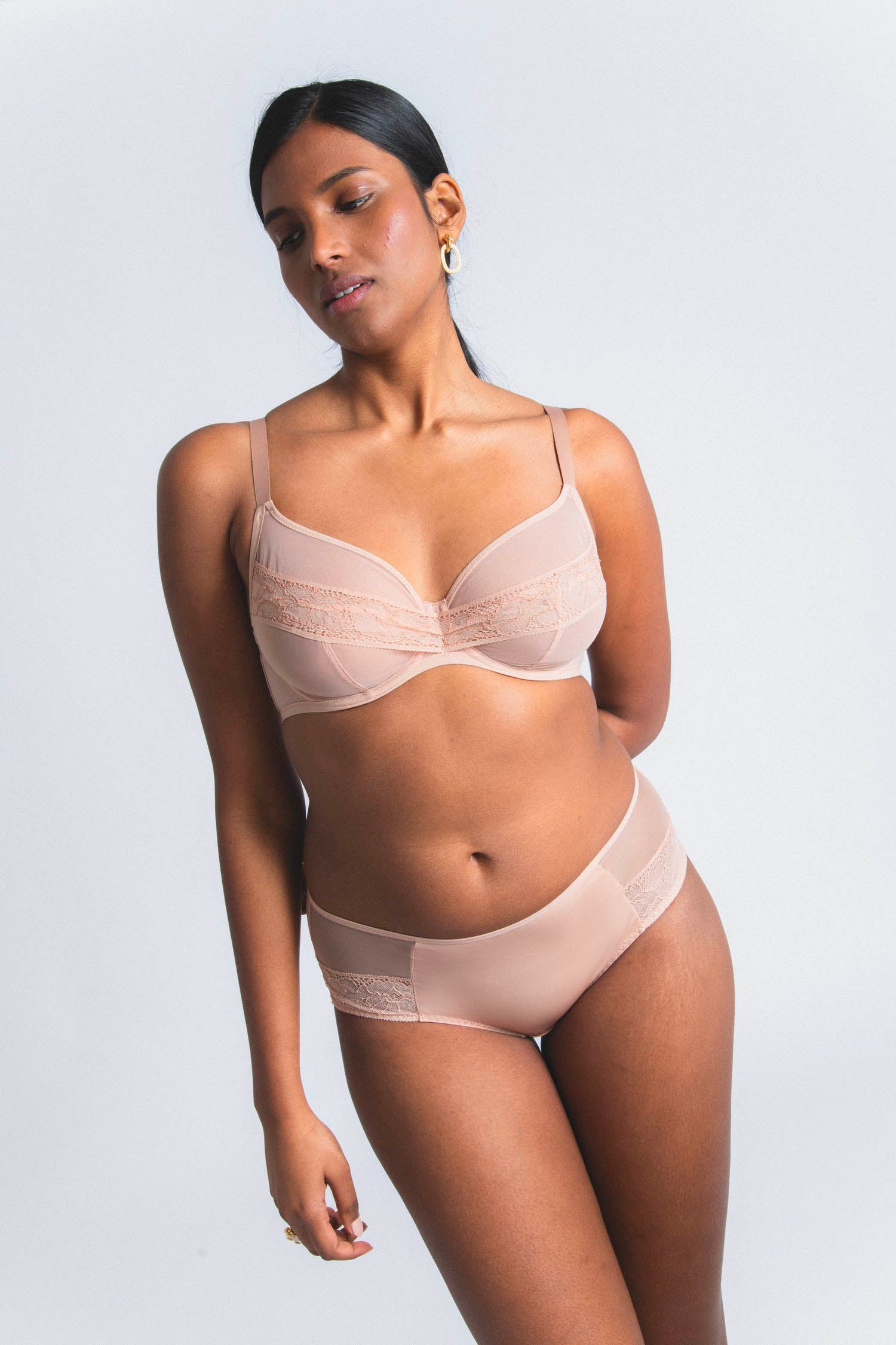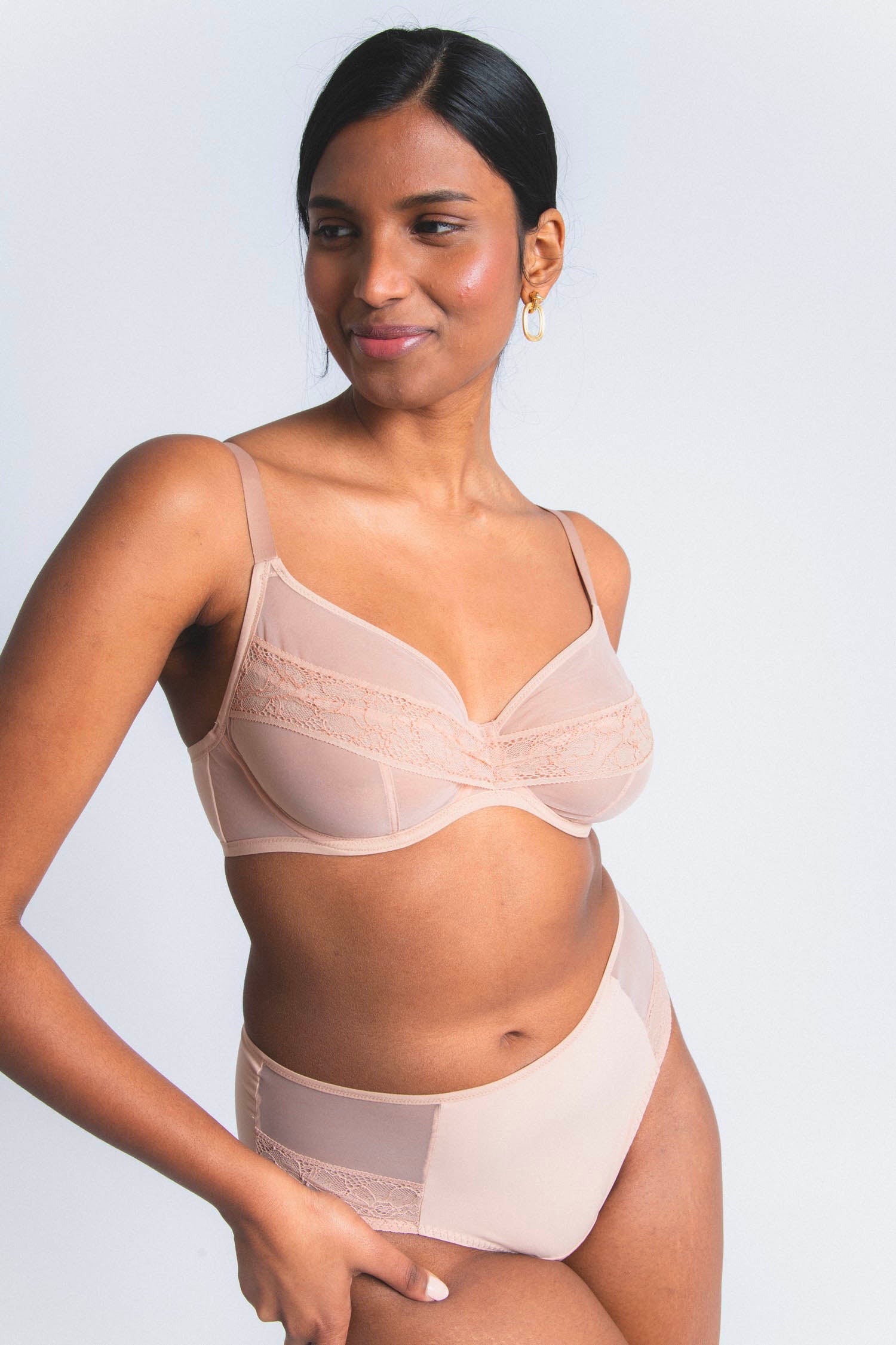 An underwired bra in French Leavers lace, designed for larger sizes, combining sensuality, comfort and support.