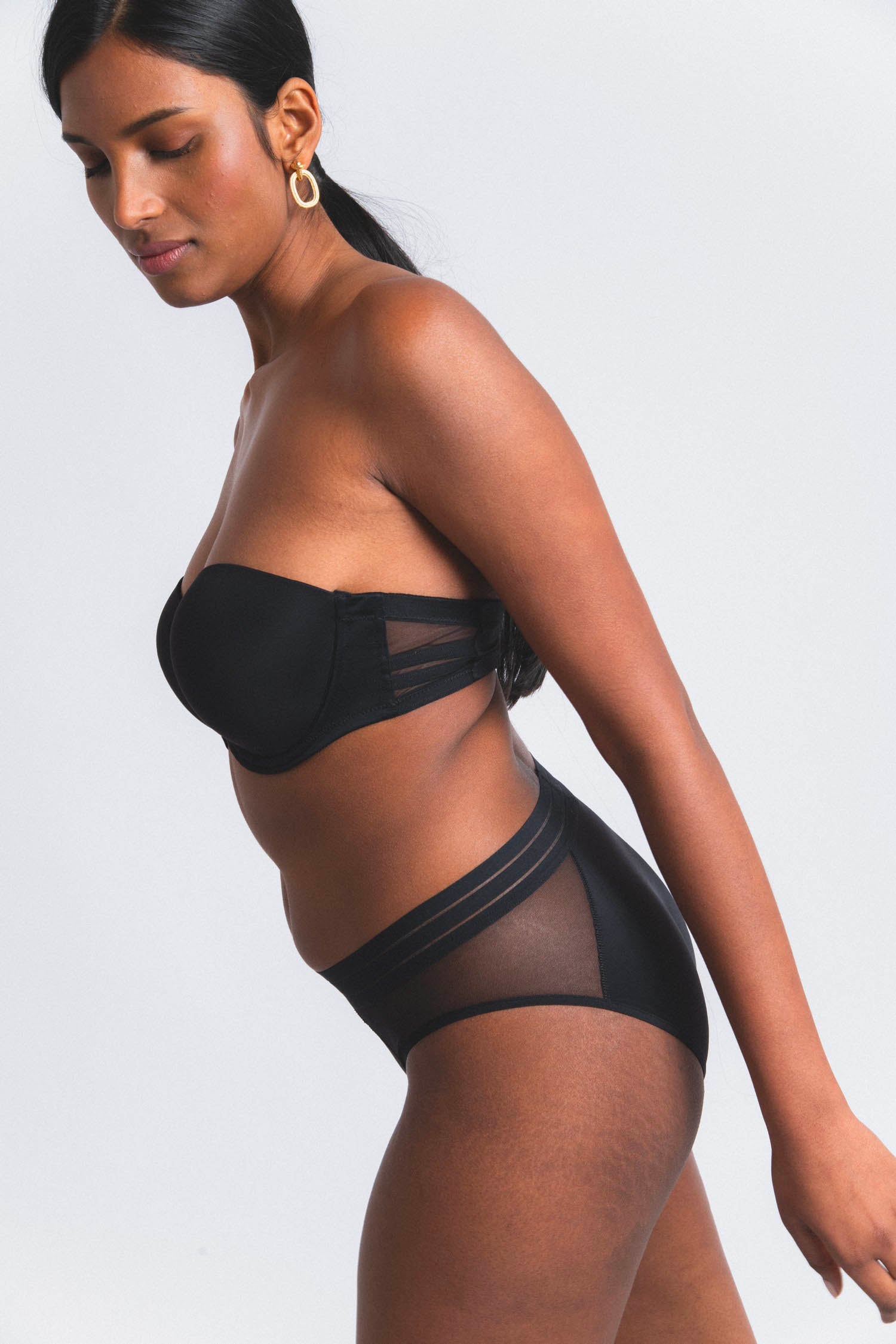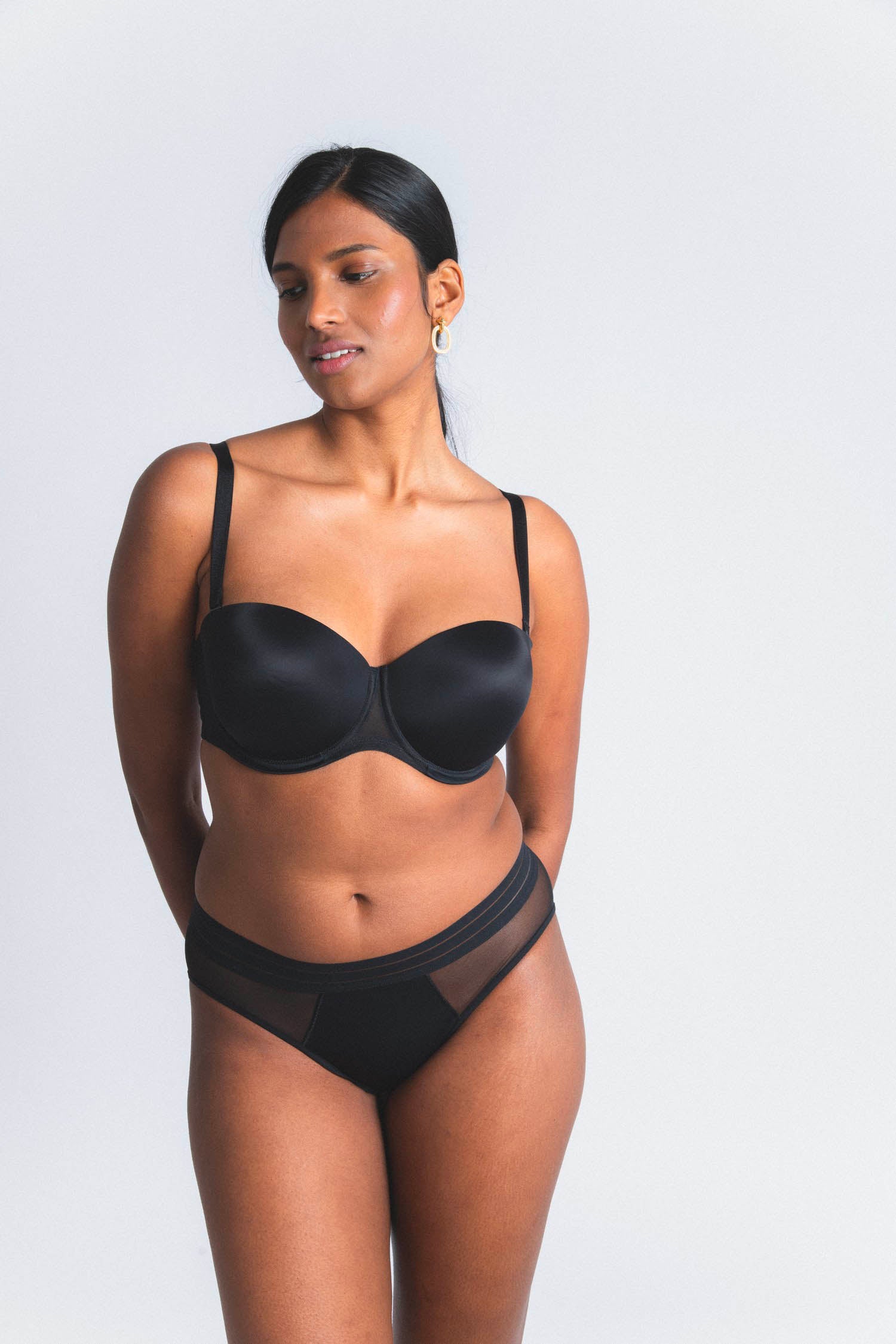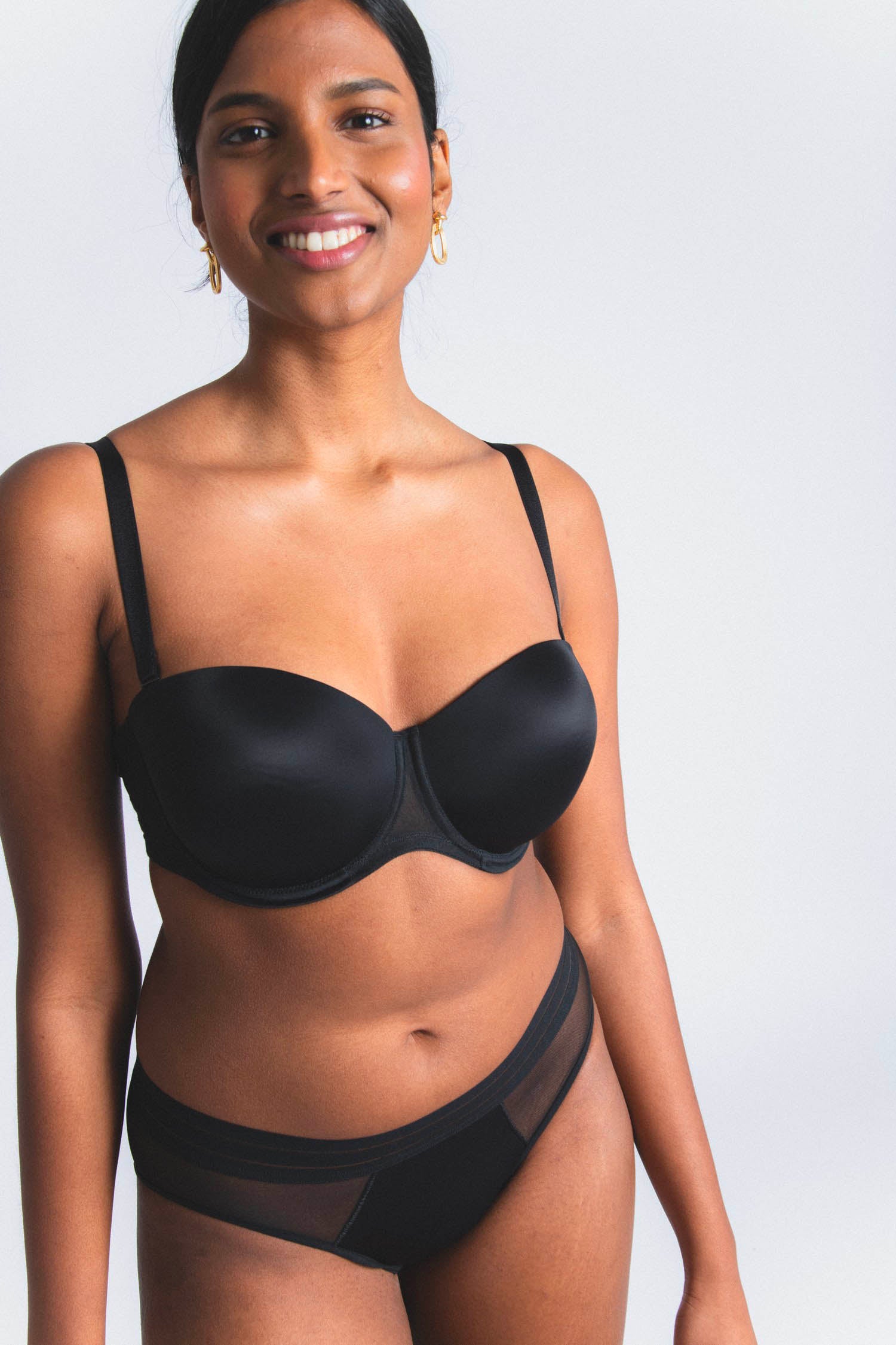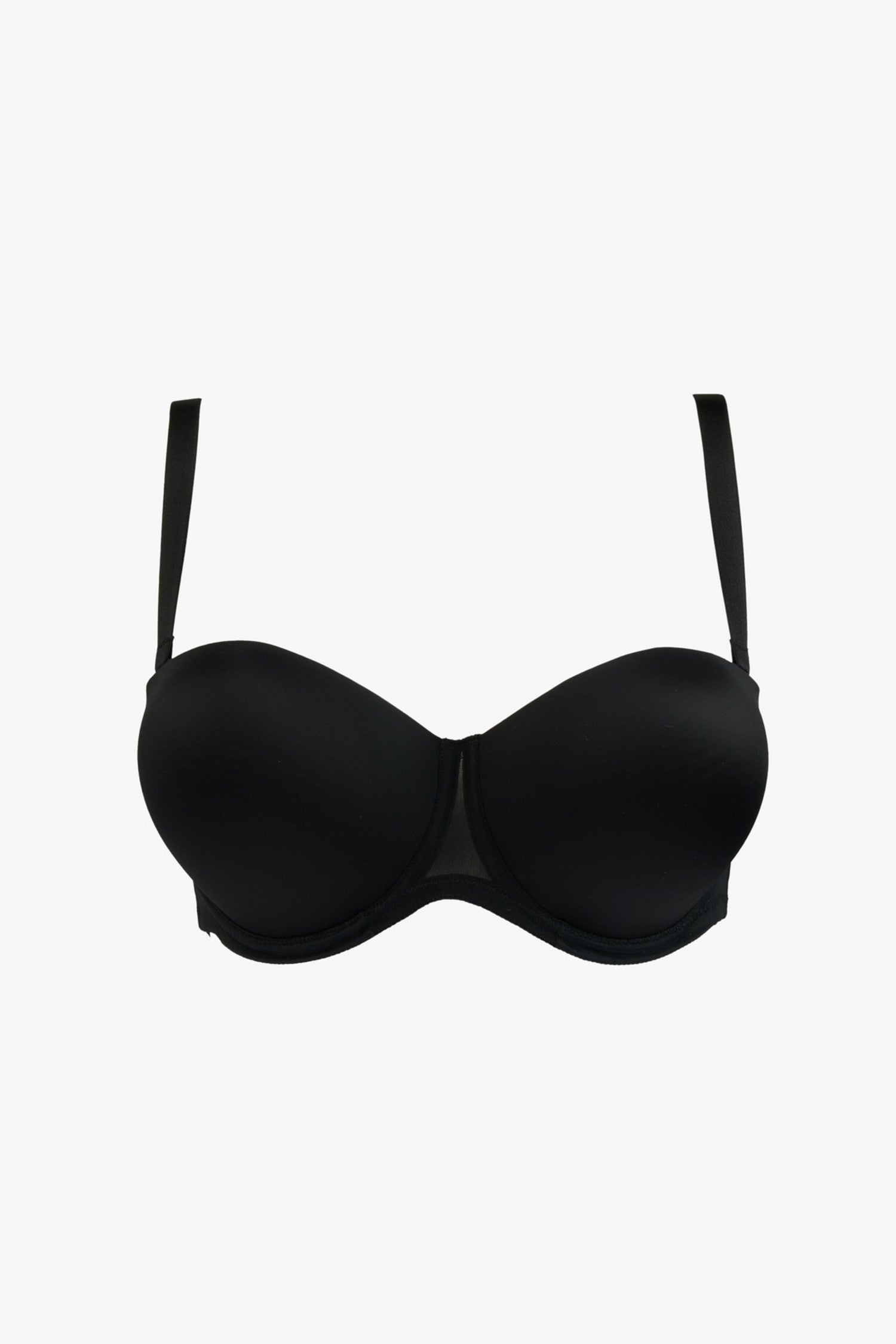 A bandeau bra with a rigid shell for a redesigned neckline and flawless support.