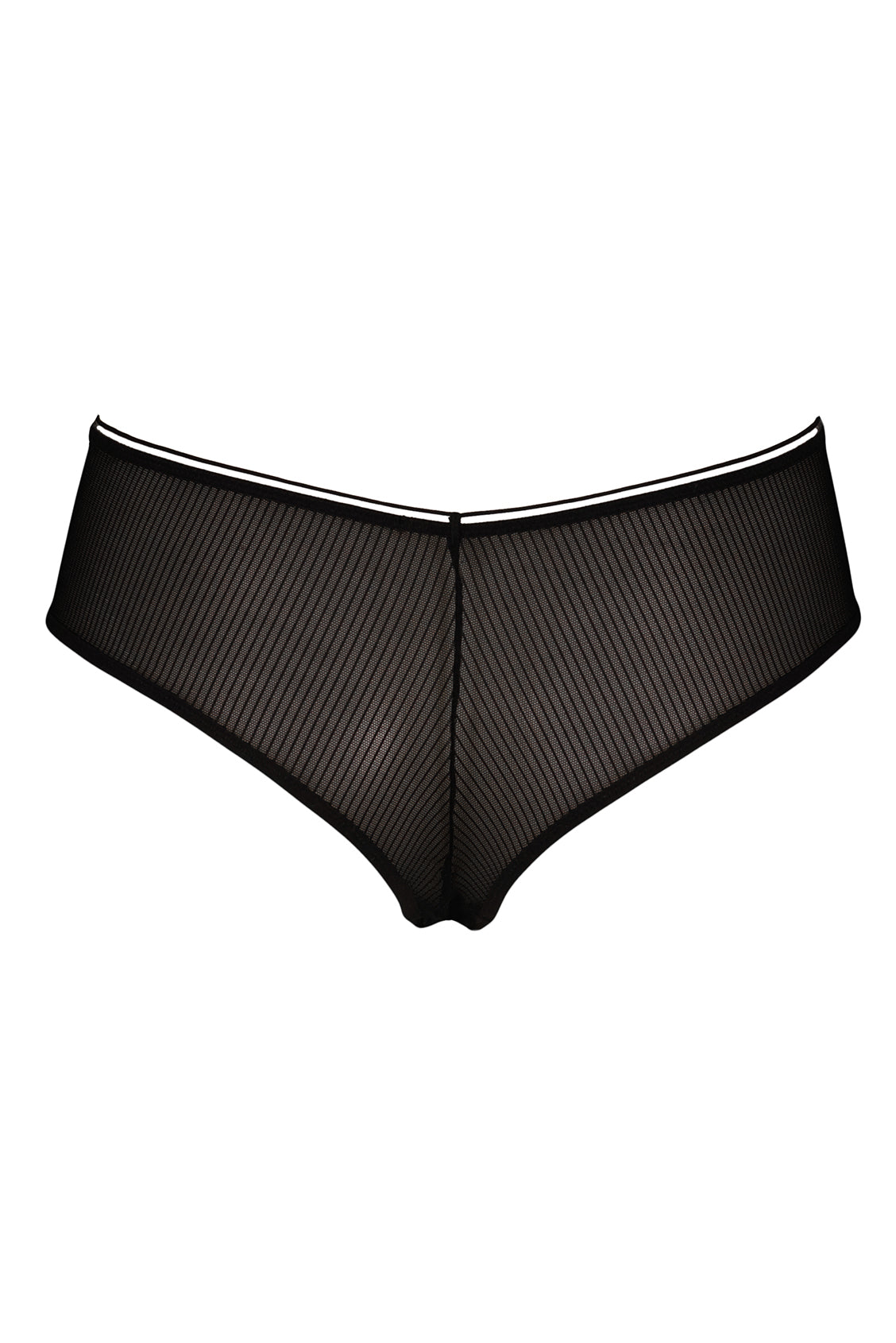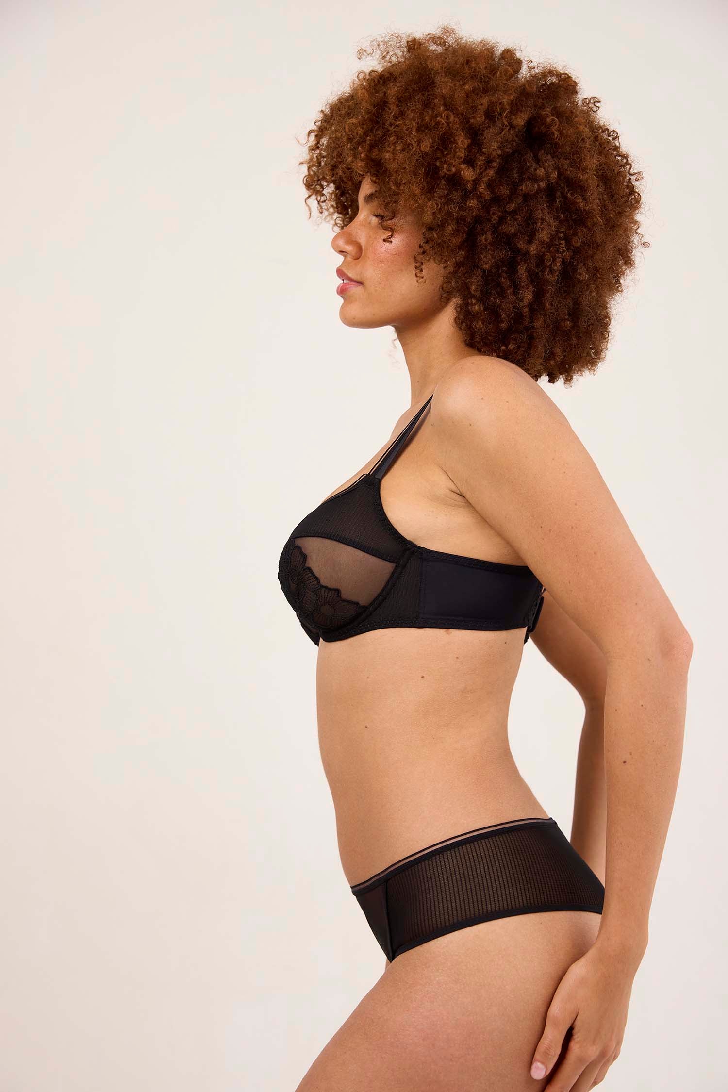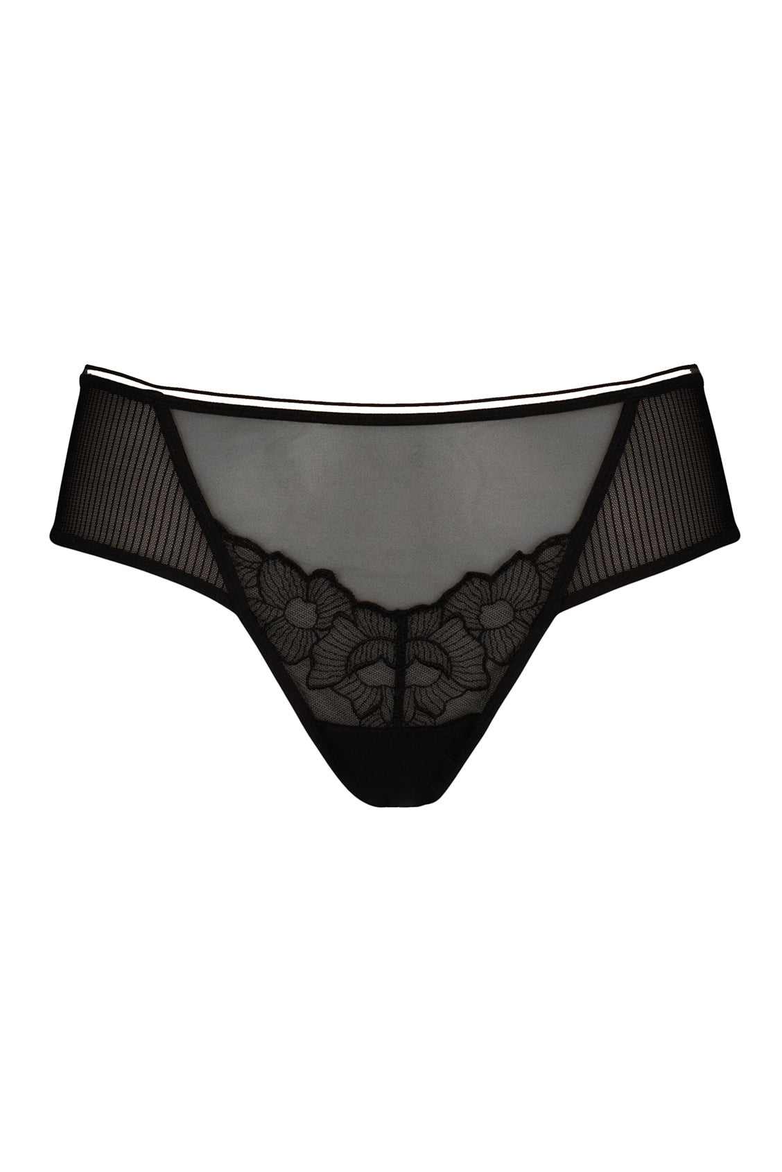 Un tanga en broderie florale et tulle rayé, tout en féminité et au bien-aller maitrisé.