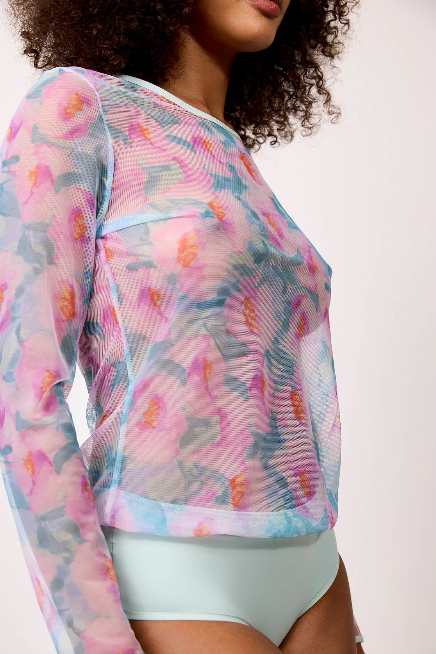 Un body manches longues en tulle imprimé transparent, à la fois graphique et délicat, pour une silhouette subtilement habillée.
