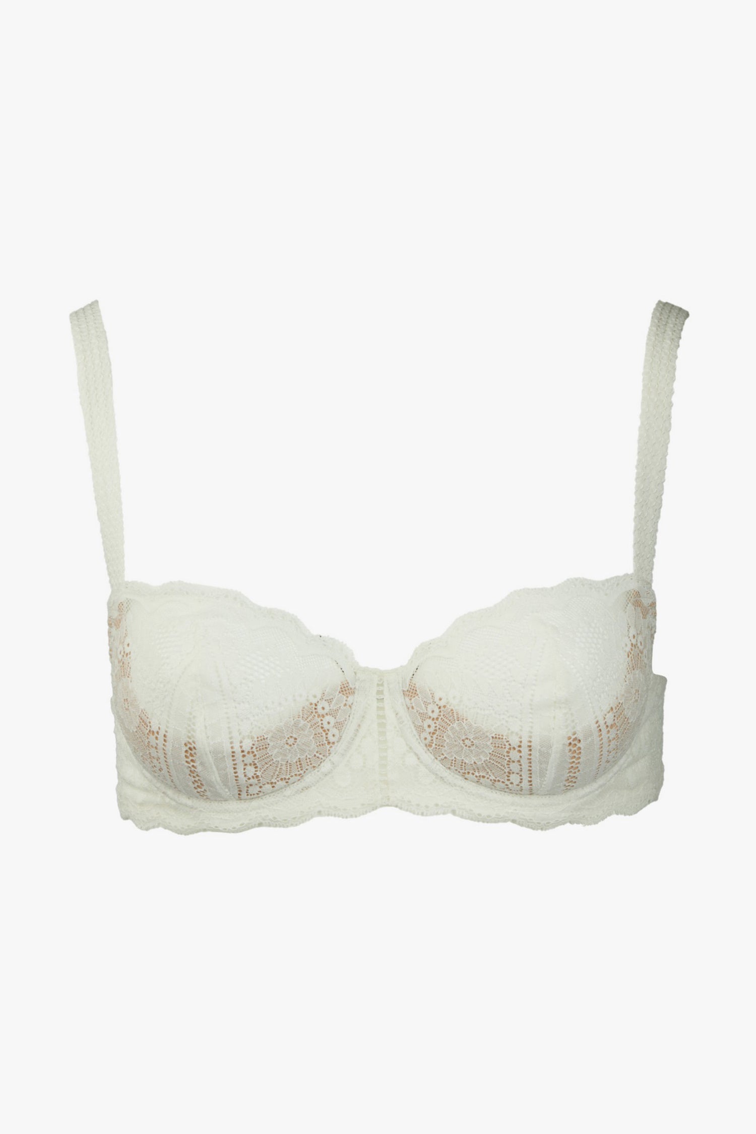 Un soutien-gorge corbeille demi-lune tout en dentelle, inspiré des archives Maison Lejaby, rendant hommage aux matières nobles et au savoir-faire historique de la maison.